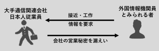 大手通信関連会社の日本人従業員が、外国情報機関員とみられる者から唆され、営業秘密を漏えい。漏えいした情報は無線基地局の実証実験に関するもので、情報機関員とみられる者は道端で偶然を装い声を掛けて社員にアプローチ。