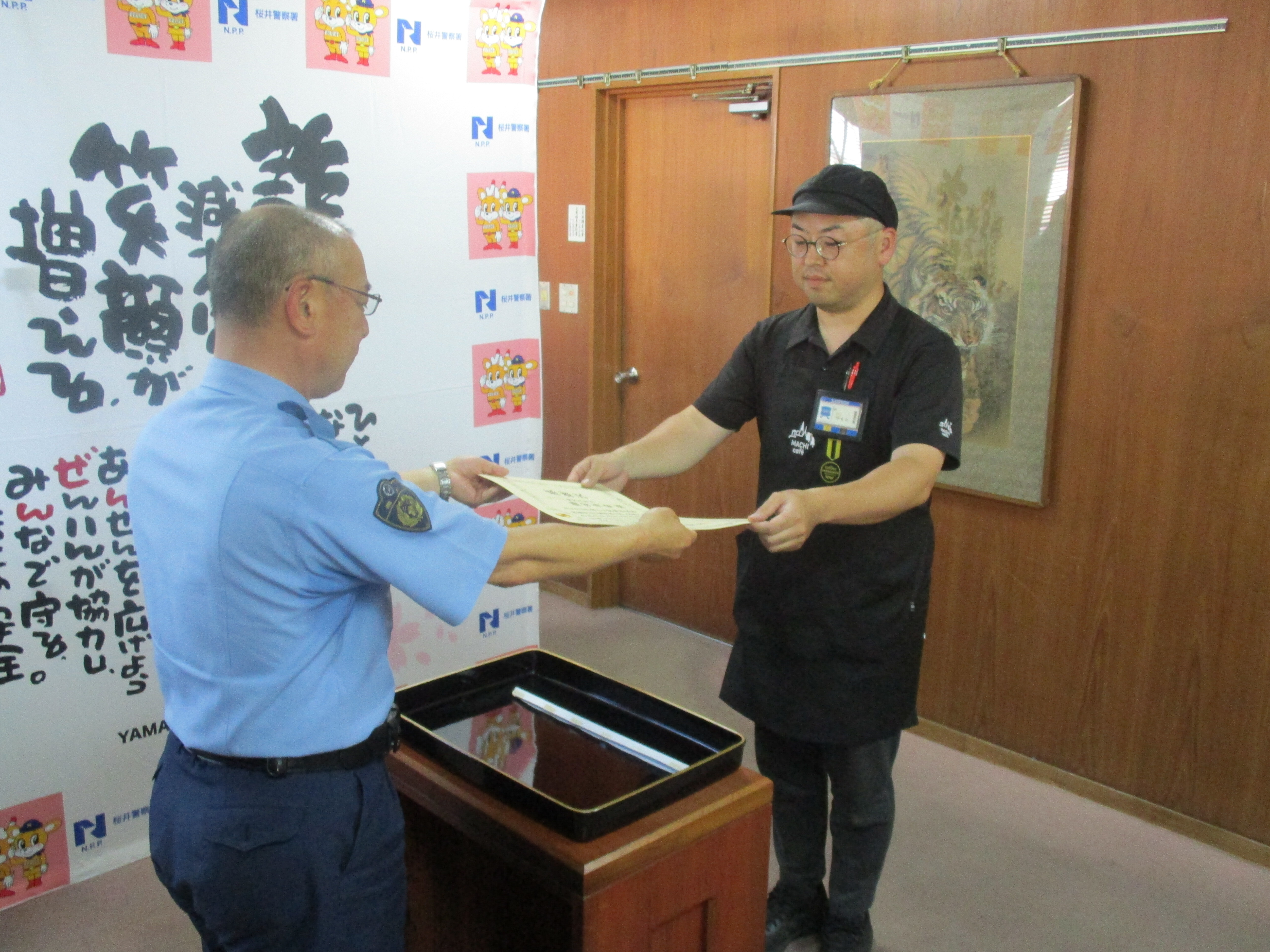 に対して、6月5日(水曜日)、桜井警察署長から感謝状を贈呈しました。