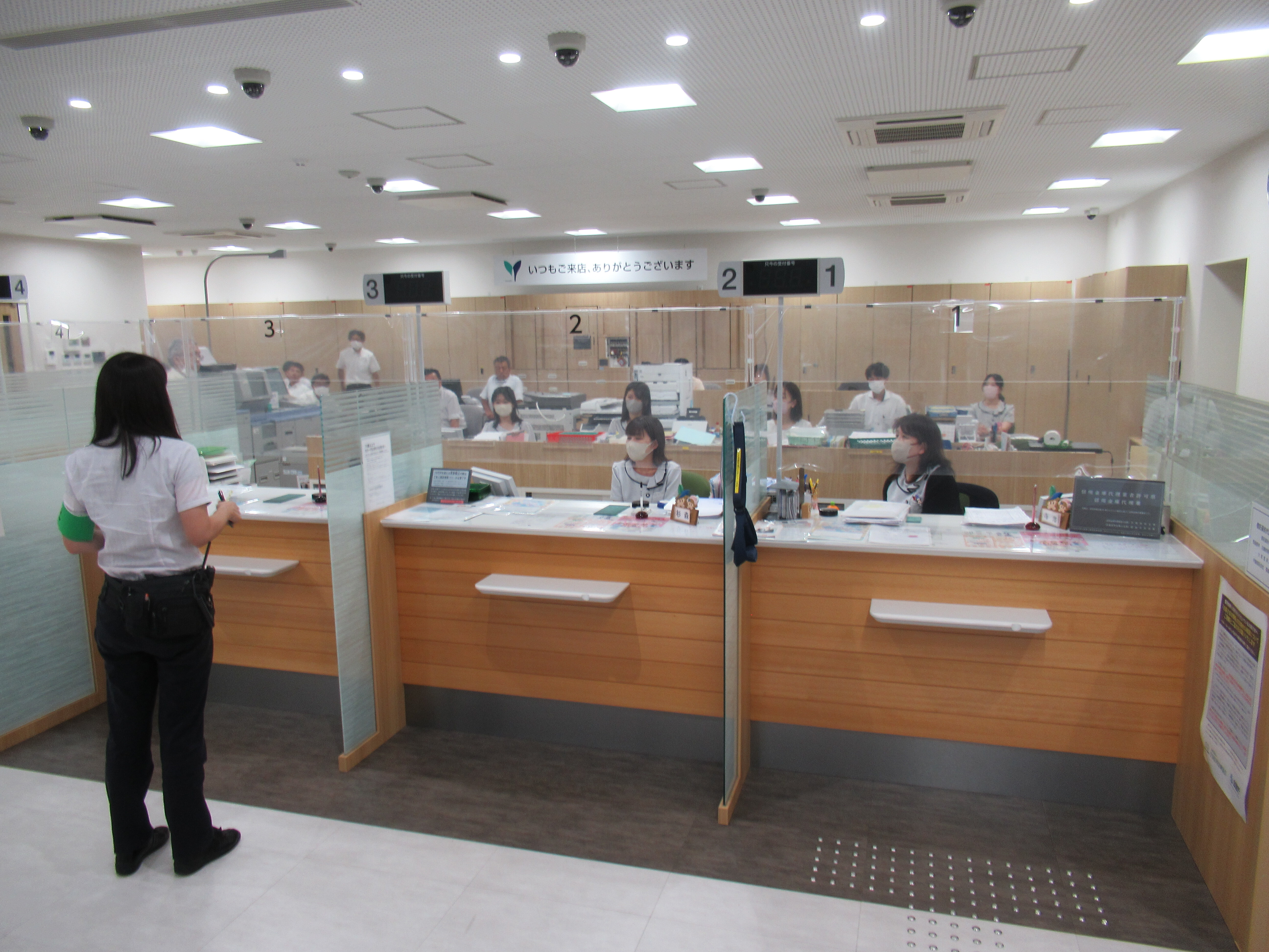 強盗訓練では、警察官が犯人役となり、カウンター越しに職員へ刃物や拳銃を突き付け、「金を出せ!」と脅した後、現金を奪い取って逃走するとの想定で、速やかに110番通報する等の対応要領について確認しました。