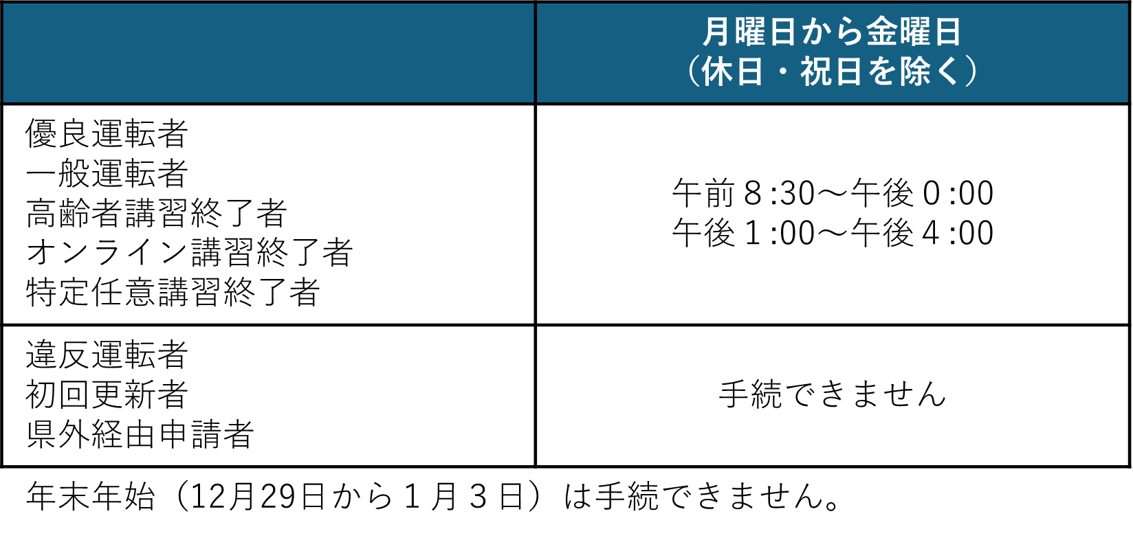 - 運転免許の効力停止中でも更新はできますが、平日のみの受付となります。