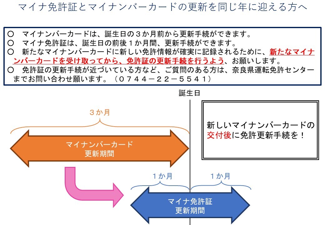 マイナンバーカードの更新は、有効期限の3か月前から手続を行うことが可能ですが、新しいマイナンバーカードの受取まで1か月程度かかります。一方、運転免許の更新期間は誕生日の前後1か月間となりますので、ゆとりを持って、マイナンバーカードの更新を先に済ませた後、新しいマイナンバーカードを持って免許情報の更新を行っていただくことをおすすめします。