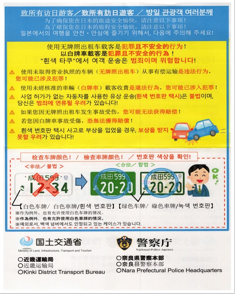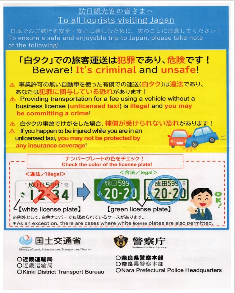 10月2日(木曜日)、奈良県警察と奈良運輸支局は、近鉄奈良駅前の行基前広場で、奈良公園を訪れるインバウンド観光客を対象に、「白タク」の違法性や危険性について認識してもらうことを目的とした街頭啓発を行いました。啓発では、英語・中国語・韓国語などで書かれたチラシを配布し、「白タク」を利用しないことを呼びかけました。