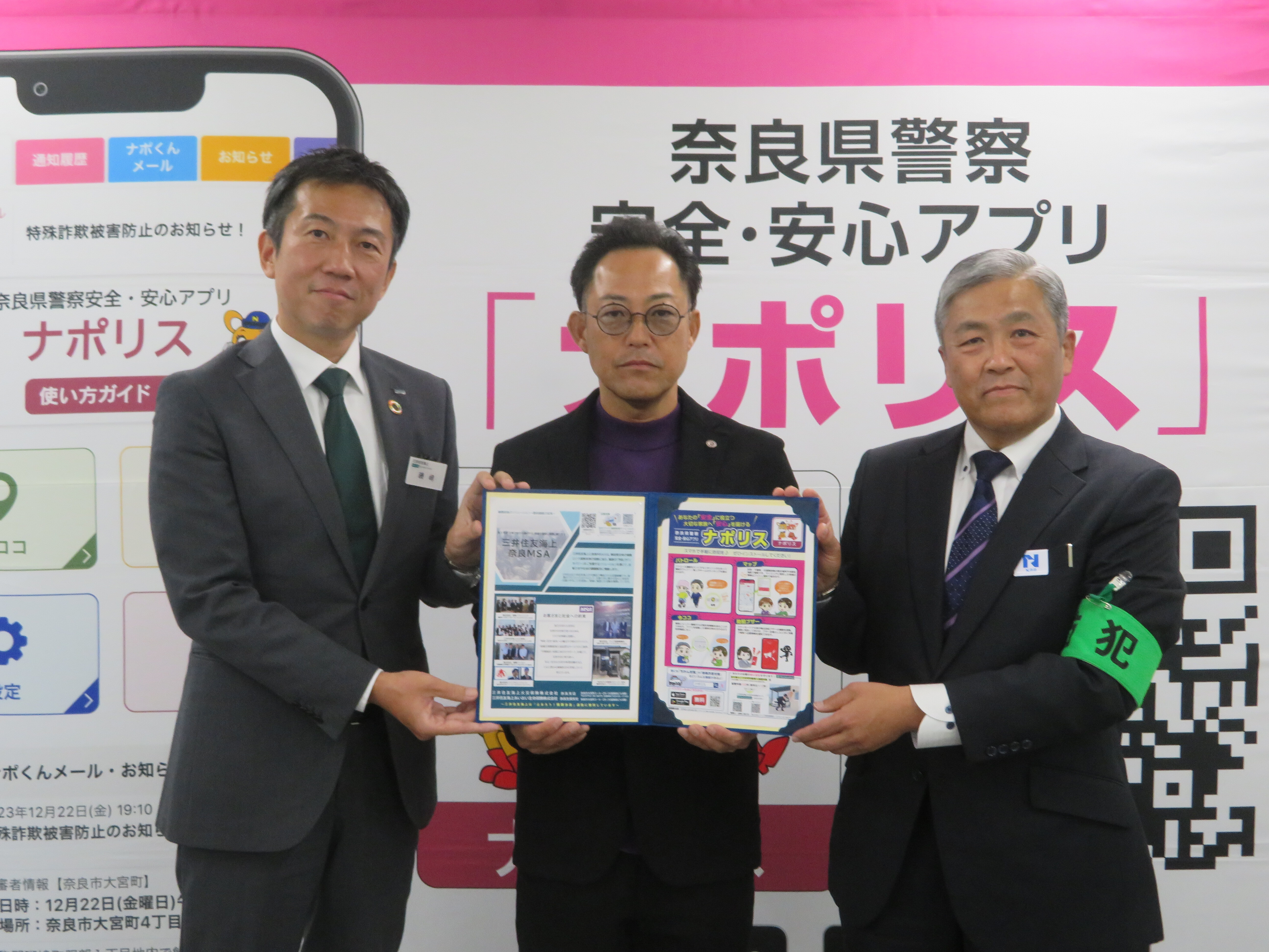 三井住友海上火災保険(株)奈良支店は奈良県警察との「安全で安心して暮らせる奈良の実現に向けた連携協定」に基づき、「ナポリス」のチラシを製作し、普及活動をスタートしました。