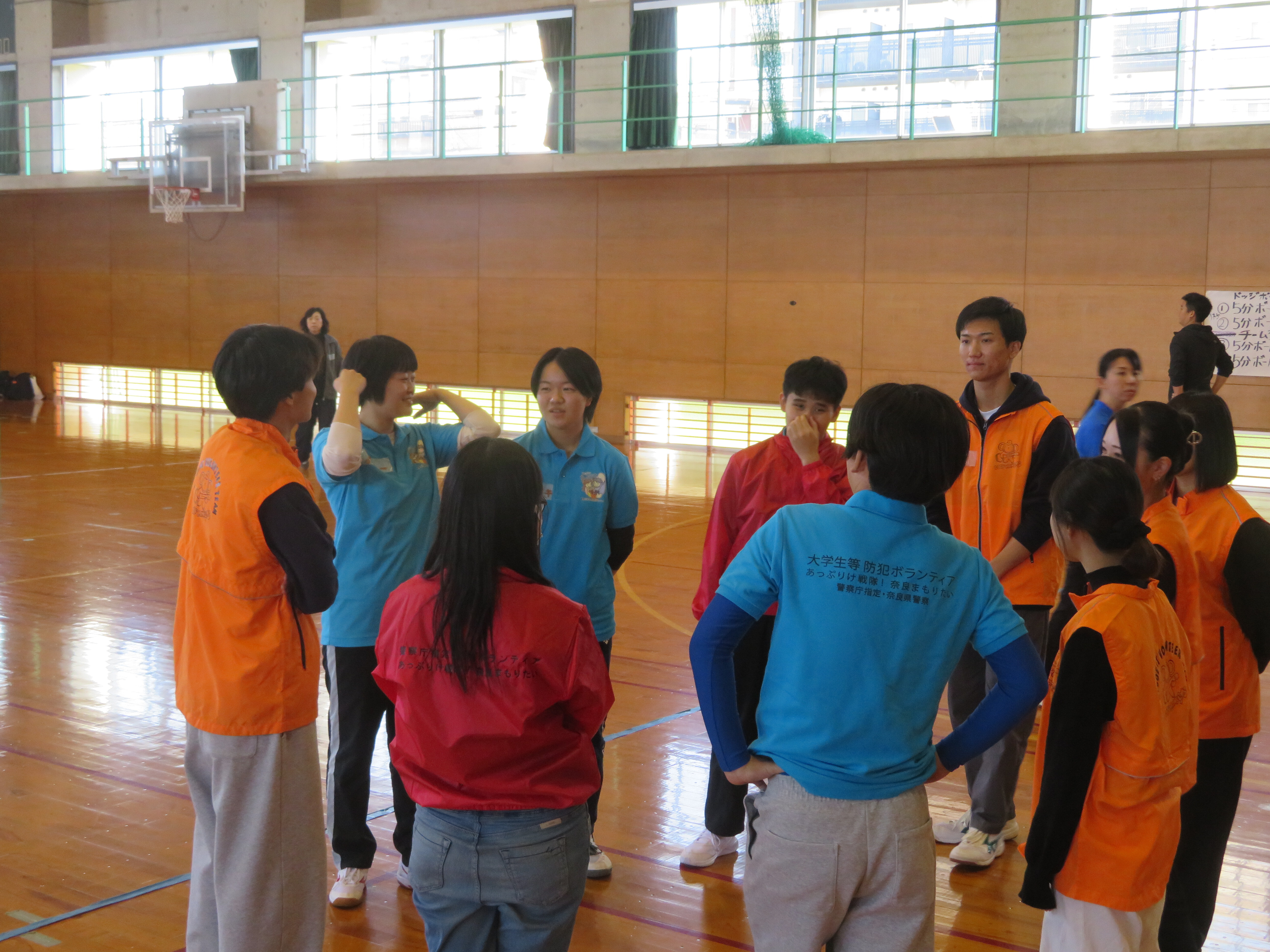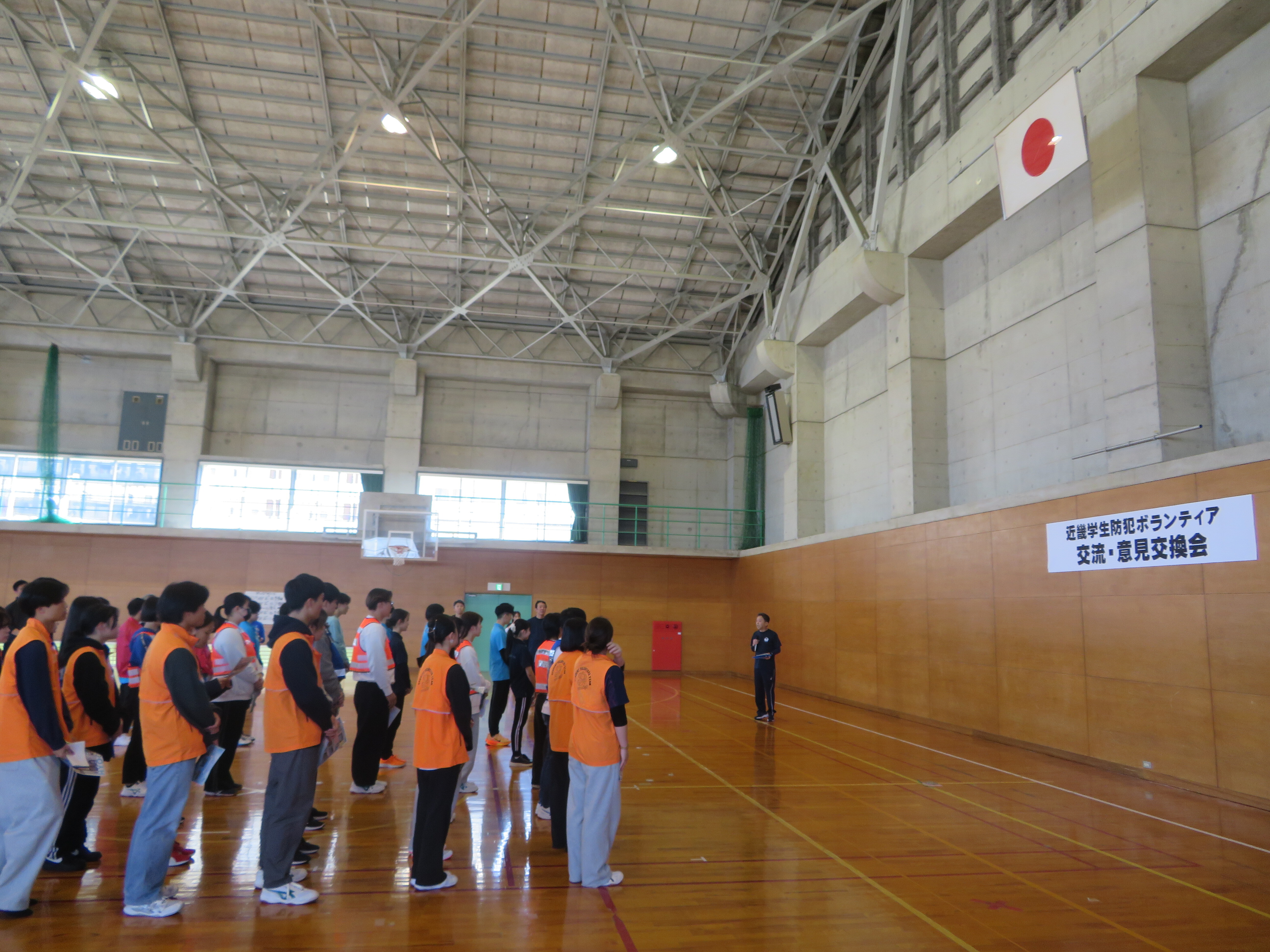 私たち「あっぷりけ戦隊!奈良まもりたい」(以下“あっぷりけ戦隊”といいます。)は、11月8日(土曜日)、京都市伏見区深草塚本町の京都府警察学校にて、京都府警察さん主催の「近畿学生防犯ボランティア交流会・意見交換会」に参加しました。参加した学生防犯ボランティアは、京都府の「ロックモンキーズ」さん、大阪府の「ミックス」さん、兵庫県の「ブルーフェニックス」さん、滋賀県「ヤングリレーション」さんと、私たちの5団体です。スポーツ交流として、府県関係ないチーム分けで、ドッジボール対決、ソフトバレーボール対決を楽しみました!ランチミーティングの後は、各団体の活動紹介の他、各々の団体が直面する課題とその対策等について意見交換をしました。この交流会は今年で2回目ですが、各団体の活動上の工夫や知見を持ち寄ることで新たな視点を持つことができ、私たちの活動を次へと繋げるヒントも得ることができました。時間はあっという間に過ぎましたが、私たち学生防犯ボランティアの互いの想いが響き合う充実した時間となりました。