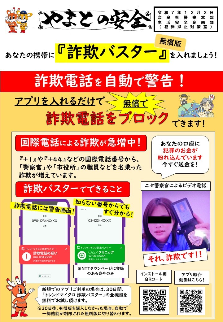 詐欺撃退アプリ『詐欺バスター』を入れれば、詐欺の電話に対して、警告表示!