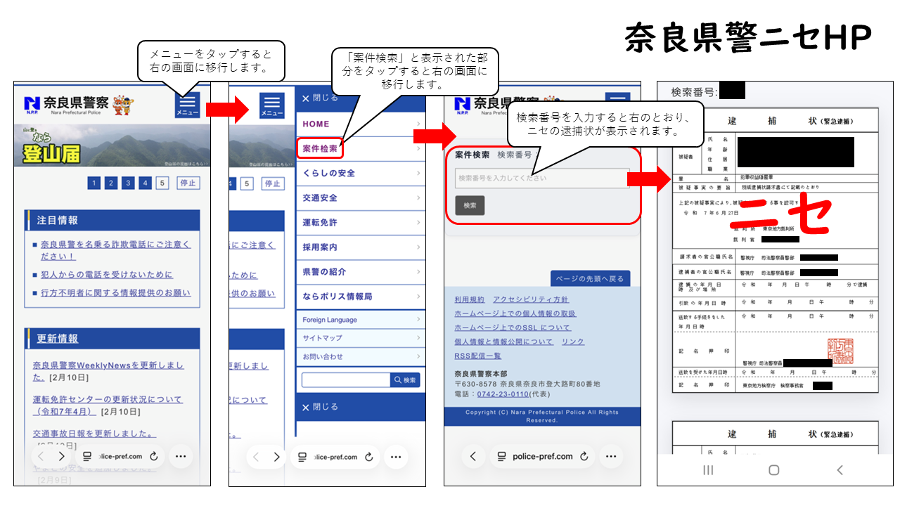 警察が逮捕状をサイト上にアップしたり、画面越しに提示したりすることは絶対にありません。