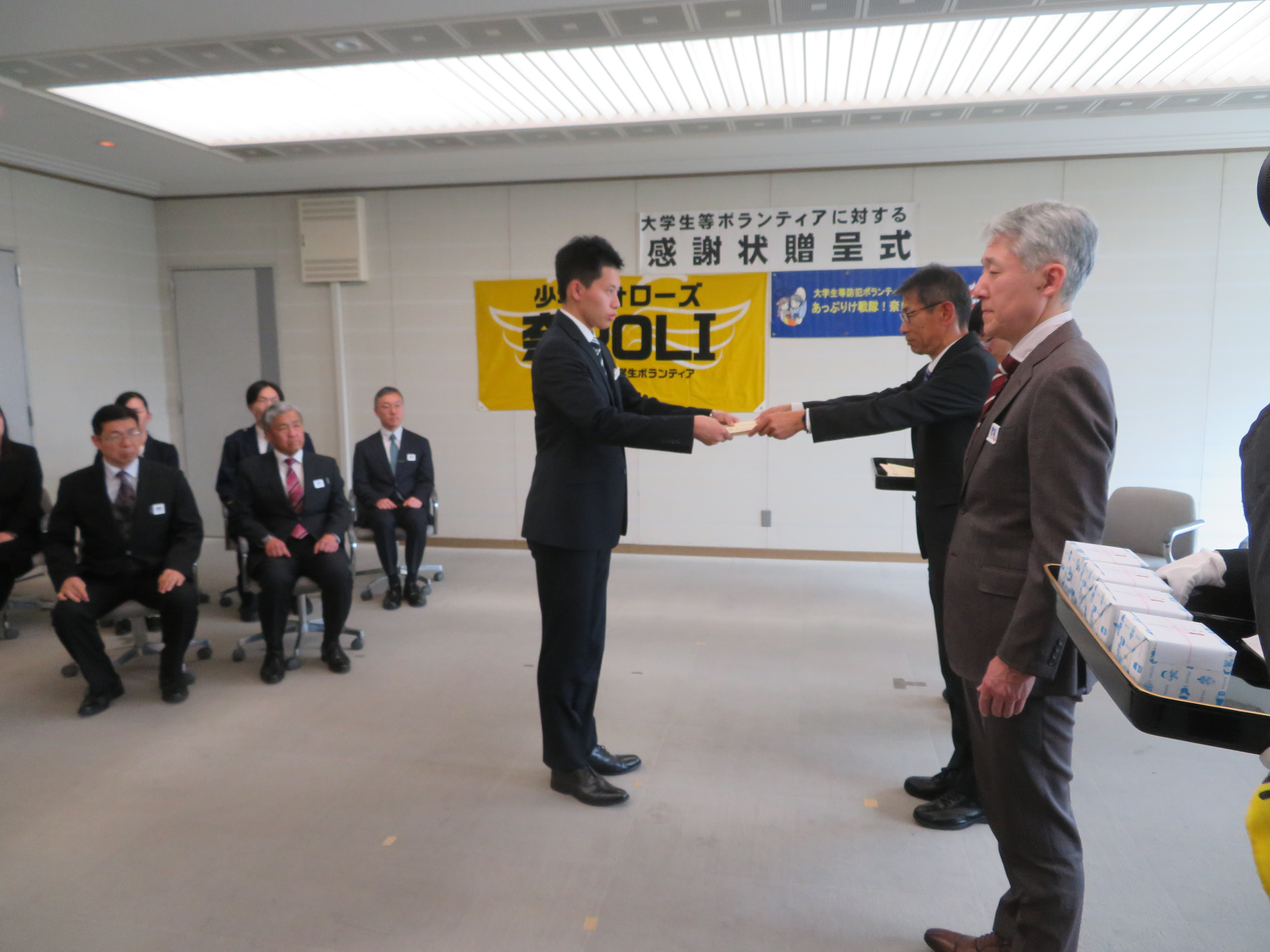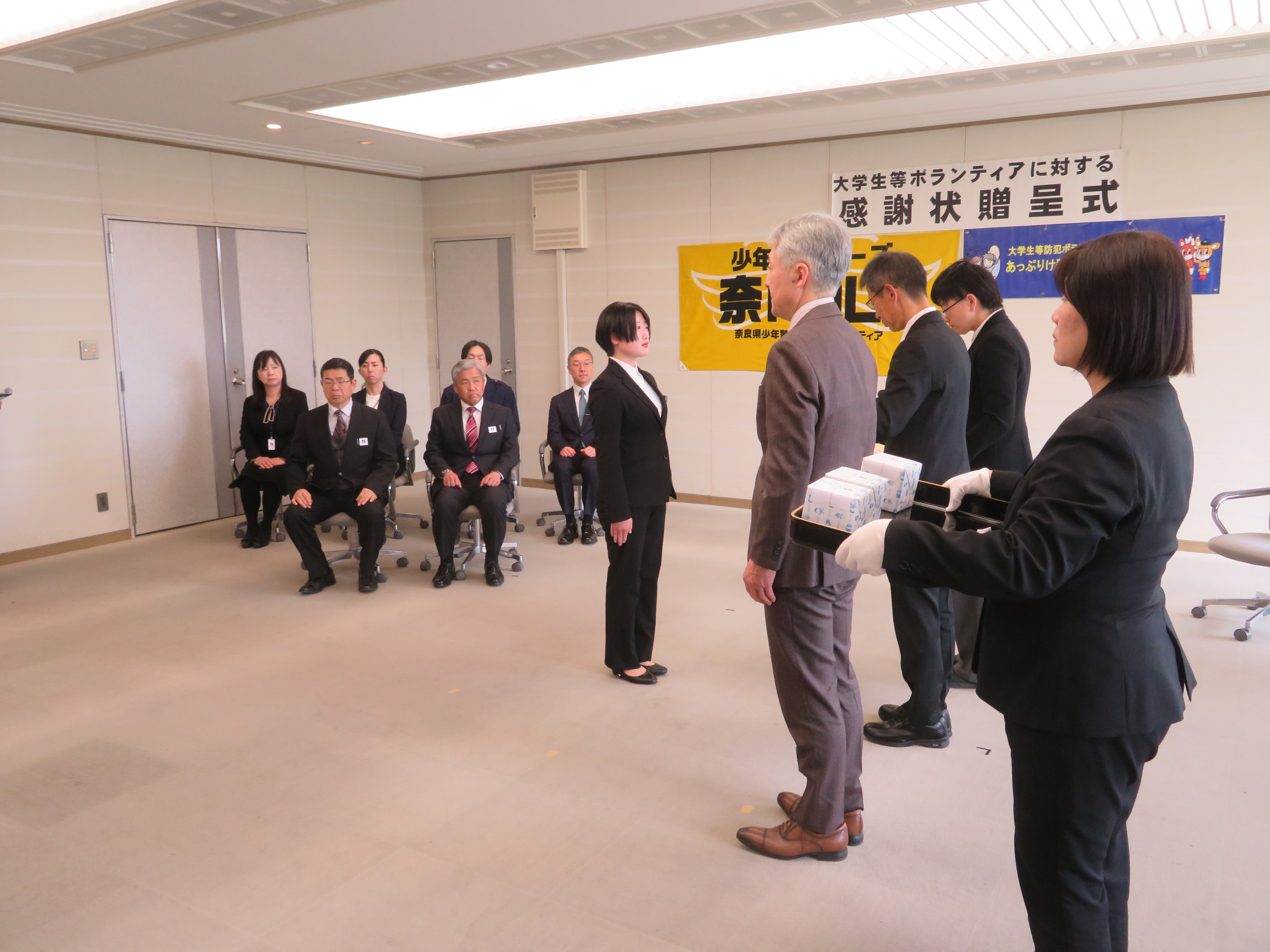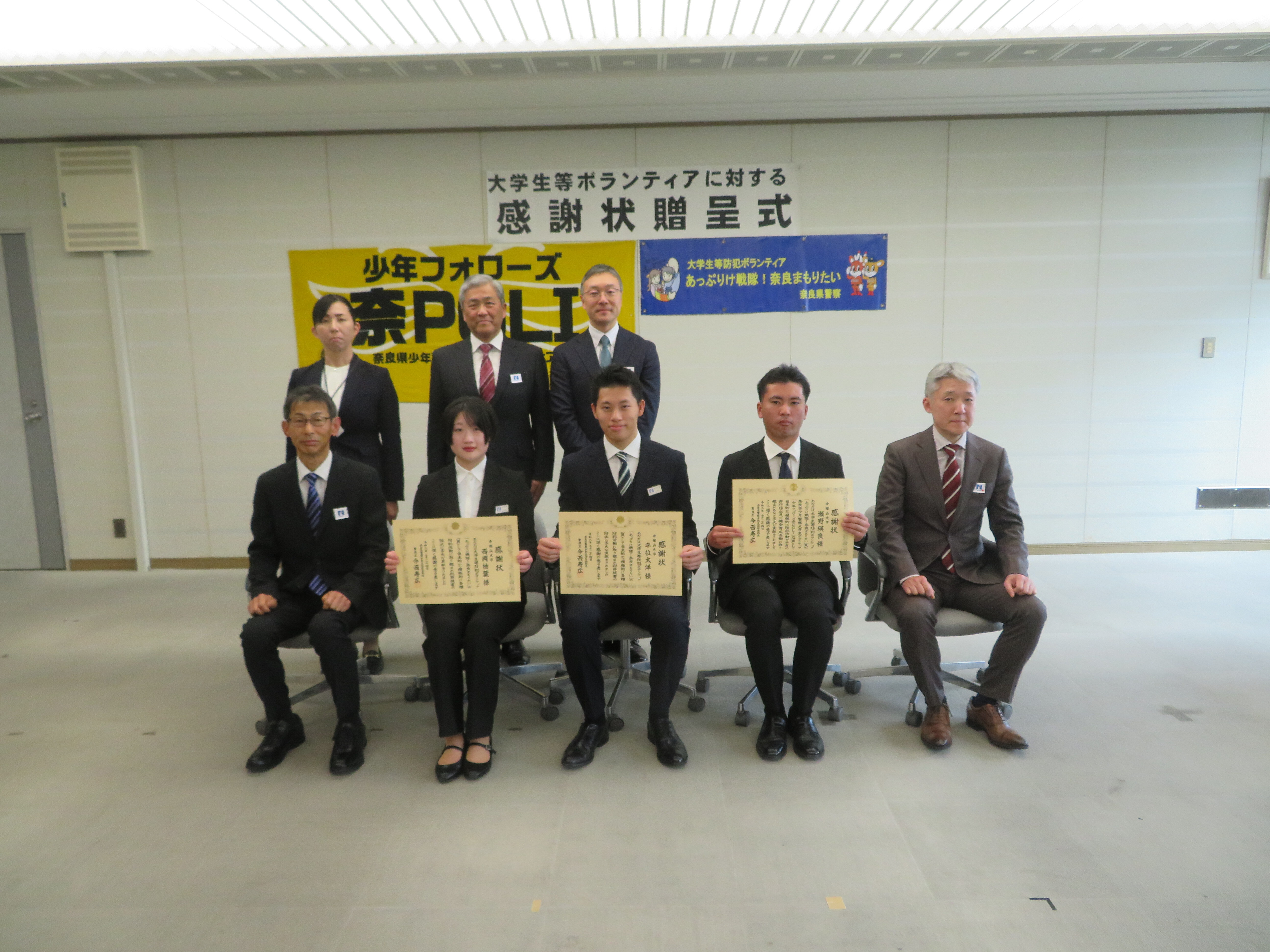 私たち「あっぷりけ戦隊!奈良まもりたい」(以下“あっぷりけ戦隊”といいます。)のうち、特に功労のあった者として、3名の隊員が、奈良県警察本部生活安全部長から感謝状をいただきました。生活安全部長より「若い視点を生かした様々防犯活動への取り組みが、地域の防犯意識の向上につながっている」とのお言葉をいただき、改めて自分たちの活動の意義を実感することができました。また、平素から活動を支えてくださっています公益財団法人奈良県防犯協会様から記念品を贈呈いただきました。